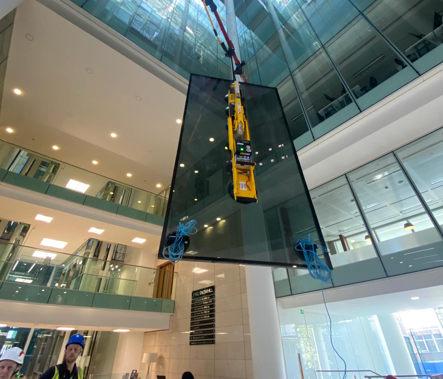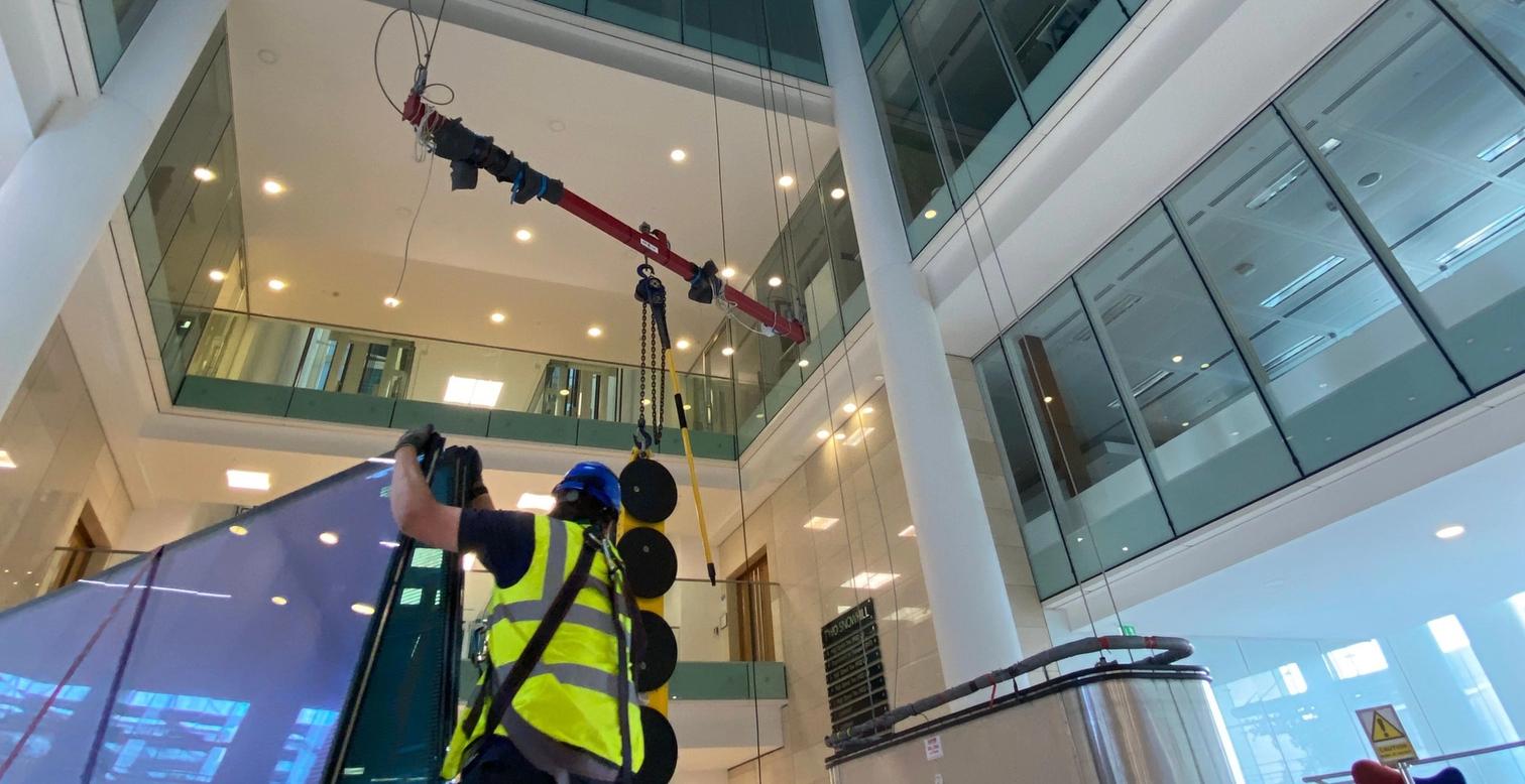 Although not always possible, thanks to our experience and contacts within the industry we were able to match the product like for like, meaning that there would be no visible difference to the atrium after the replacements had been complete.A&C worked closely with building management to fulfil the requirements of both management and occupant expectations. The client required us to turn around the project as quickly as possible. To facilitate the quick turnaround we devised a new method of lifting the glass through the inside of the building rather than crane lifting the glass externally. In order to allow us to access the atrium safely we installed a temporary man safe system across the atrium to assist with our safe method of working. Changing the lifting method and location gave us more scope to deliver the works quickly, as it removed delays caused by inclement weather.