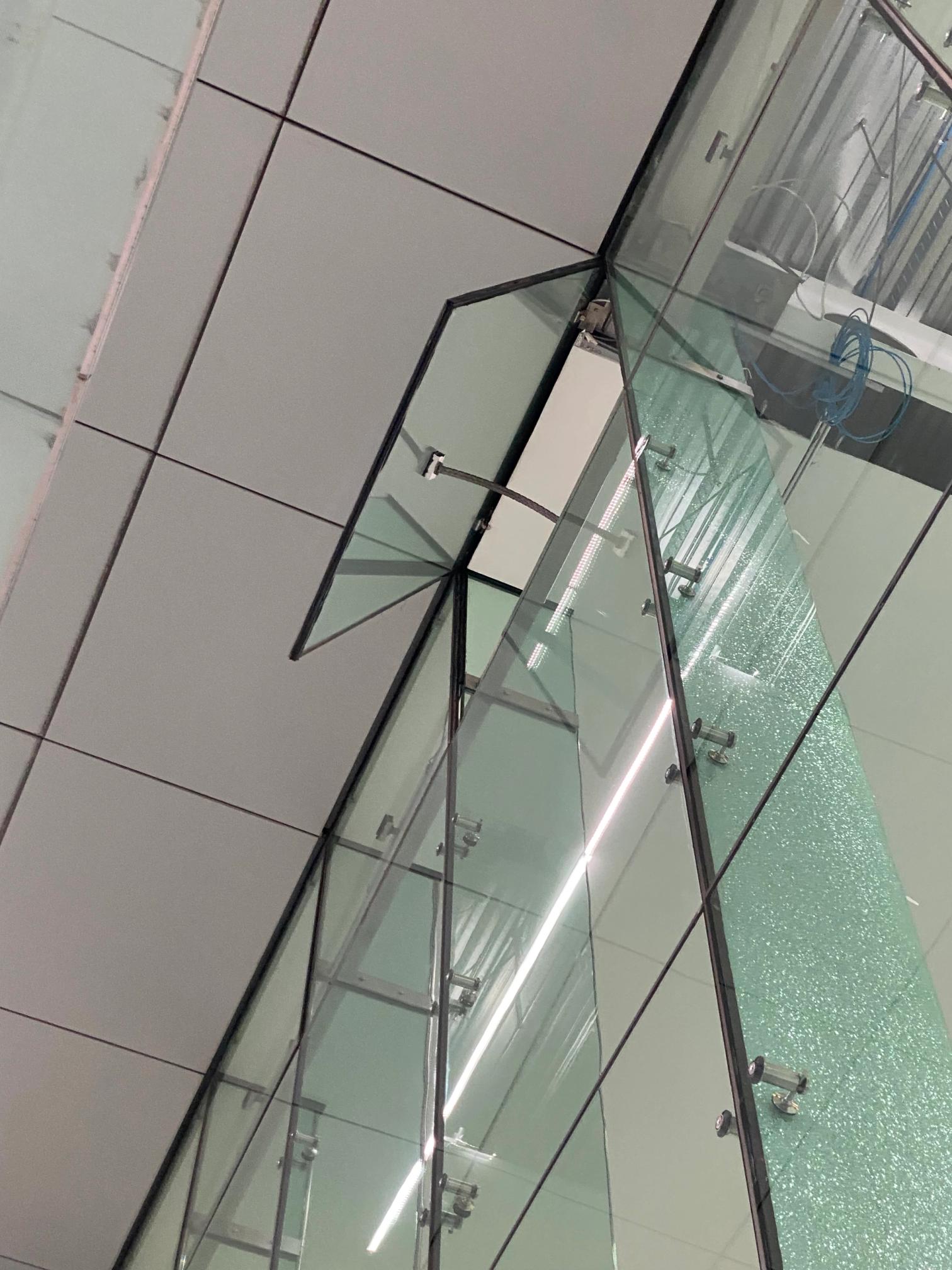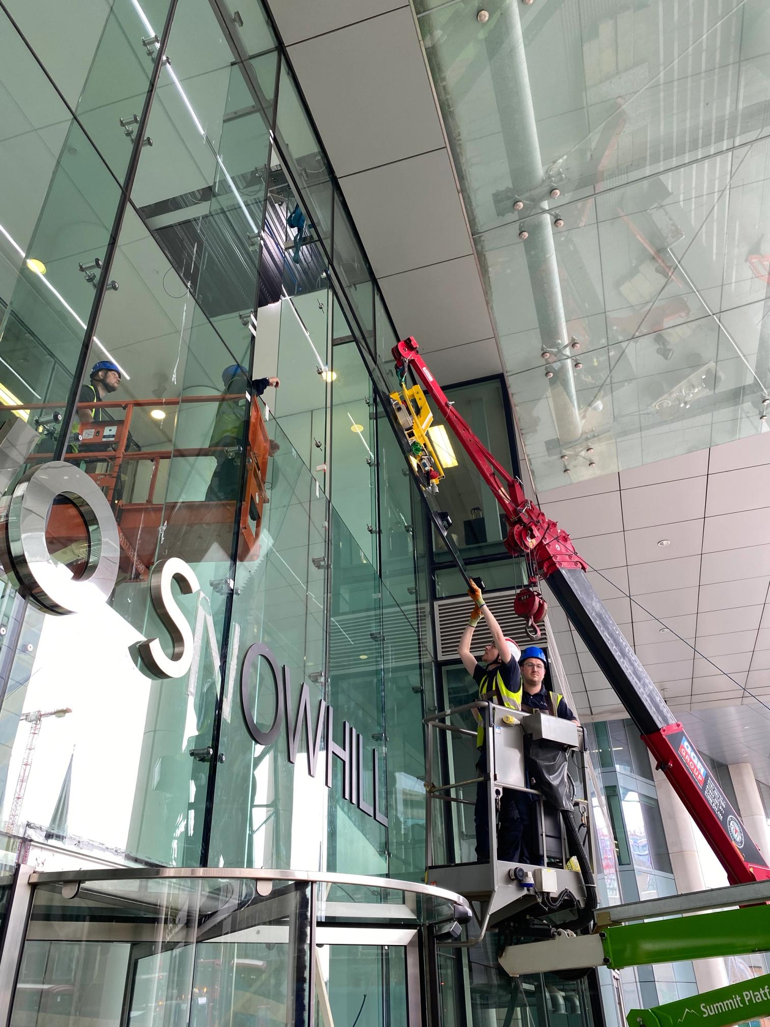 The broken glass at site was a 10m tall structural glazed fin located internally behind the main entrance glass screen. The glass fin is connected to the main entrance screen via bolt-on fixings. To remove and replace the fin the entrance screen would need to be removed. We worked closely with CBRE and the building team to set up a secure weathertight area that would allow us to carry out the works without affecting the building occupants or affecting the security of the site.